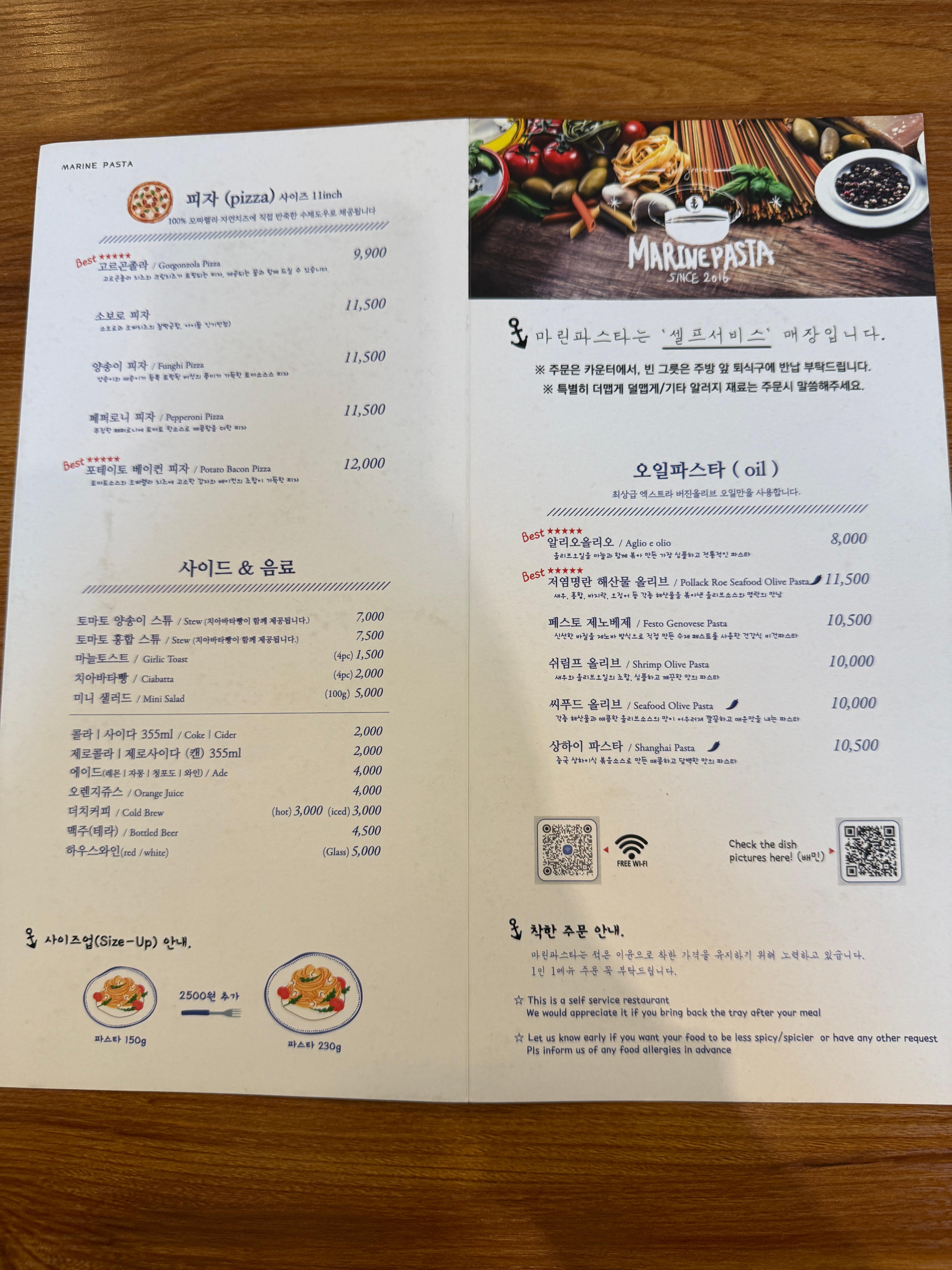 마린파스타는 신선한 해산물을 베이스로 한 파스타 전문점 브랜드로, 부산대점은 깔끔하고 모던한 인테리어가 특징입니다. 화이트 톤의 벽면과 우드 테이블이 어우러져 편안한 분위기를 자아내며, 2인·4인 테이블은 물론 적당한 크기의 룸도 구비되어 있어 가족 모임, 데이트, 동아리 회식 등 다양한 목적에 적합합니다.