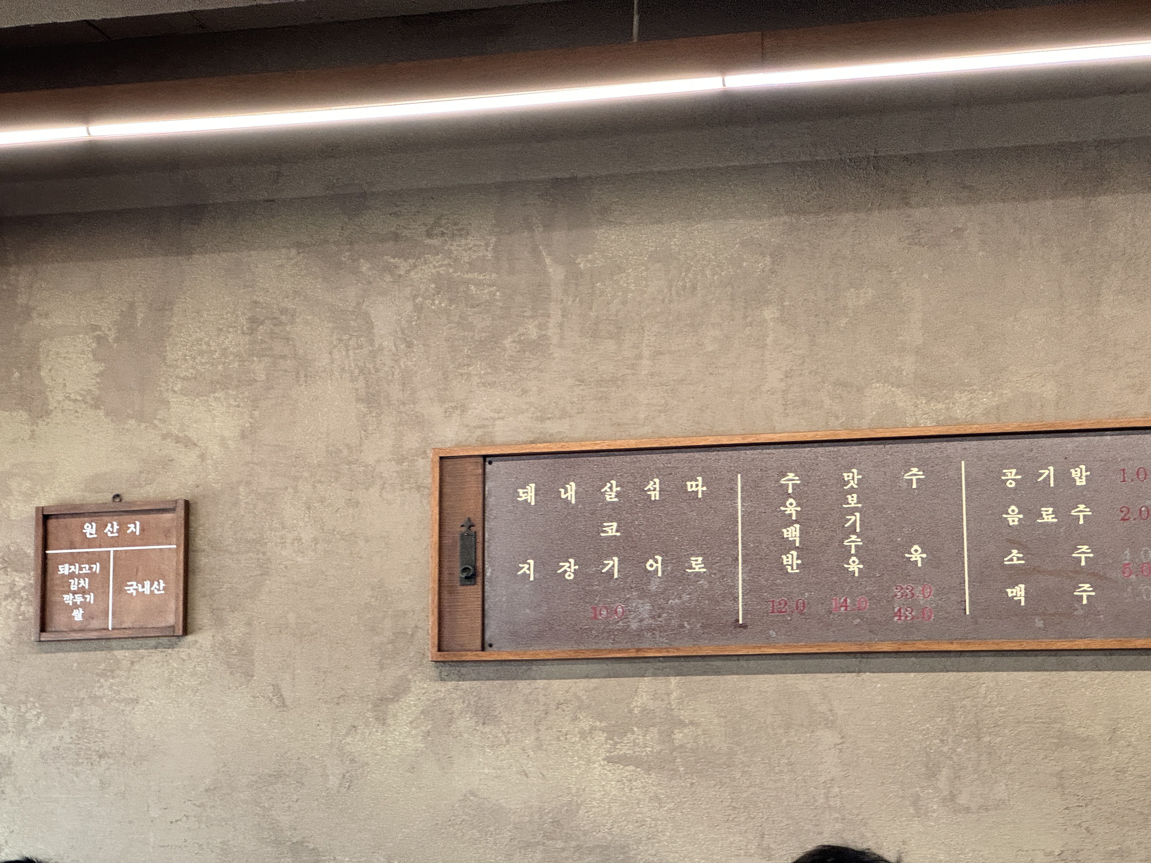 메뉴판을 보면 전통적인 국밥 메뉴들이 정갈하게 나열되어 있어요. 대표 메뉴는 단연 돼지국밥(9,000원)이며, 고기가 넉넉하게 들어가 있어 푸짐함을 자랑합니다. 그 외에도 순대국밥(9,000원), 내장국밥(9,000원), 수육백반(12,000원) 등이 있어 선택의 폭이 넓어요. 특히 모듬수육(소 20,000원 / 대 30,000원)은 둘 이상 방문했을 때 함께 즐기기 딱 좋은 메뉴랍니다.