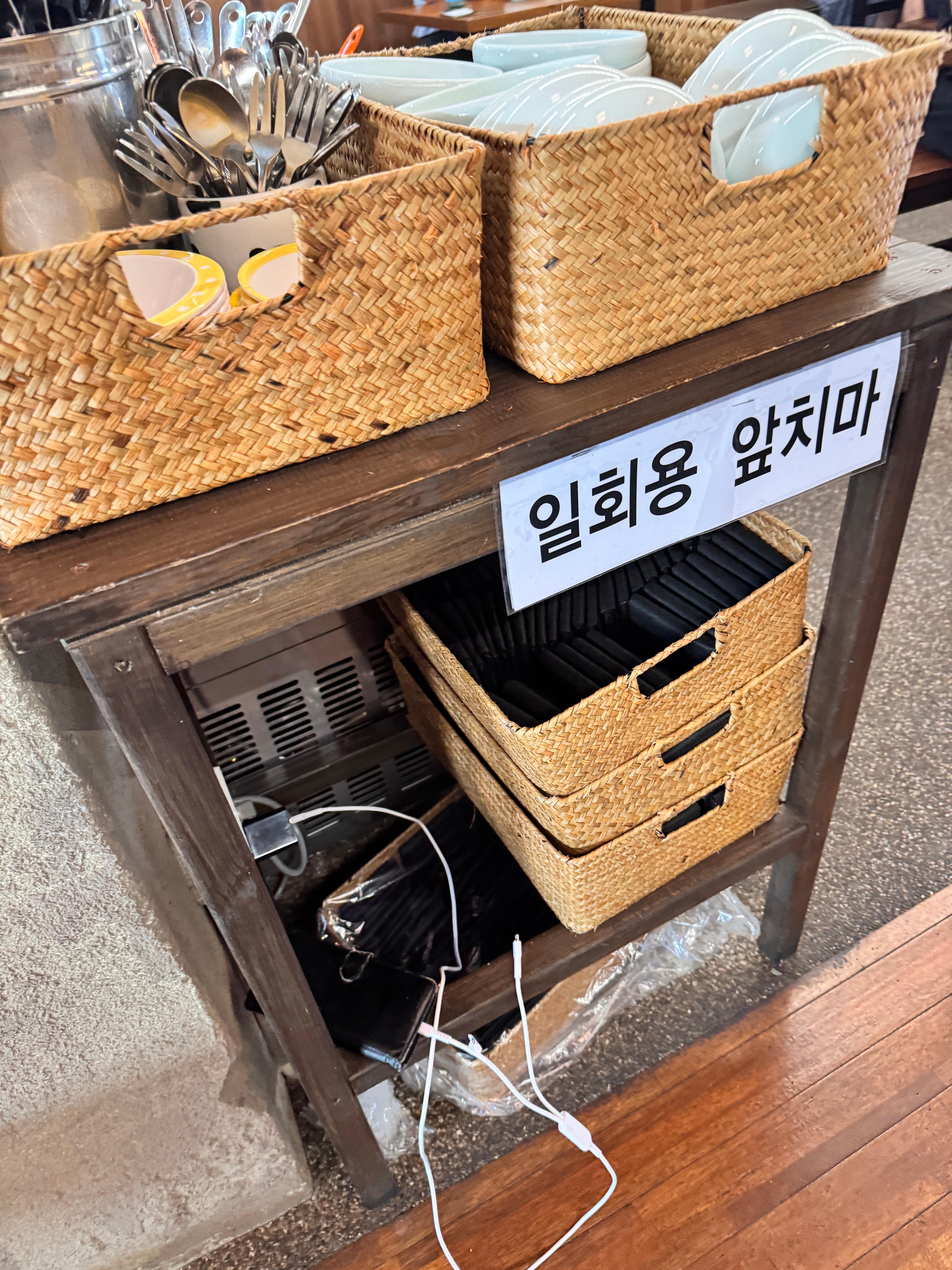 기본 밑반찬은 셀프로 리필이 가능합니다. 무김치와 부추무침은 특히 맛있기로 유명하답니다!