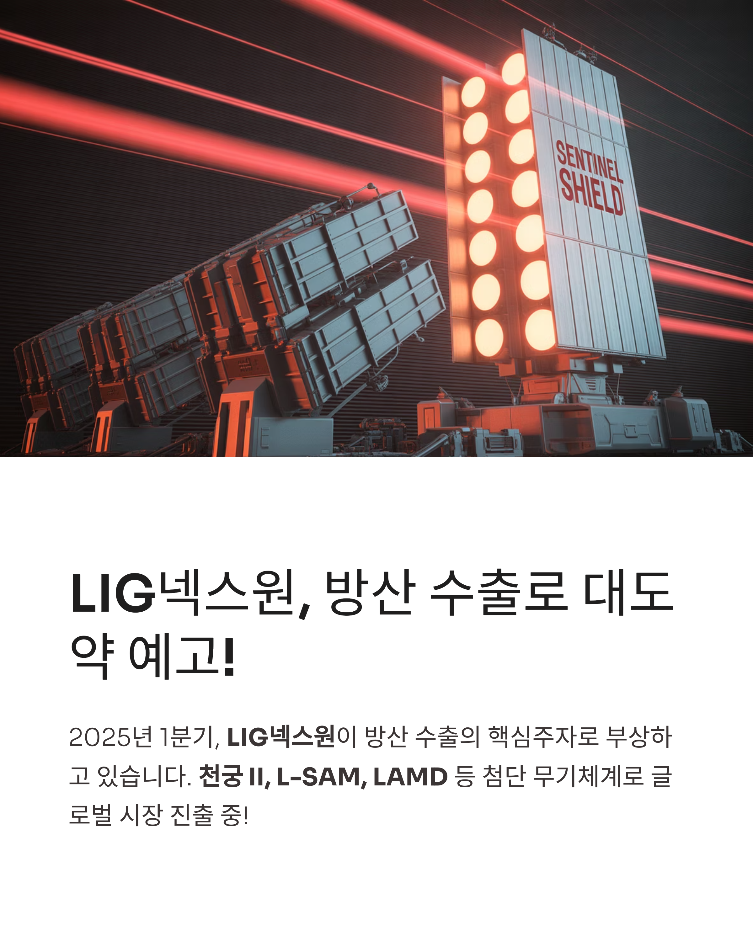 2025년 1분기 기준, LIG넥스원(079550)은 강력한 실적 성장과 함께 방산 수출의 핵심주자로 떠오르고 있습니다. 국내 방위산업에서 오랜 업력을 바탕으로 체계 개발과 수출에 성공한 LIG넥스원은 이제 천궁 II, L-SAM, LAMD 등 첨단 무기체계를 통해 글로벌 시장에서 입지를 넓혀가고 있습니다.